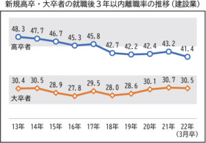 厚生労働省は、2022年3月卒業の新規学卒就職者について、就職後3年以内の離職状況をまとめた。建設業をみると、離職率は前年比1.2ポイント減の35.4%。高卒就職者は1.8ポイント減の41.4%、大卒就職者は0.2ポイント減の30.5%となり、いずれも低下している。
