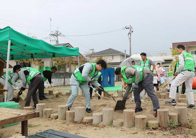 トピック園児の安全願い奉仕活動、砂場の抗菌化を実施/佐賀県建設業協会青年部